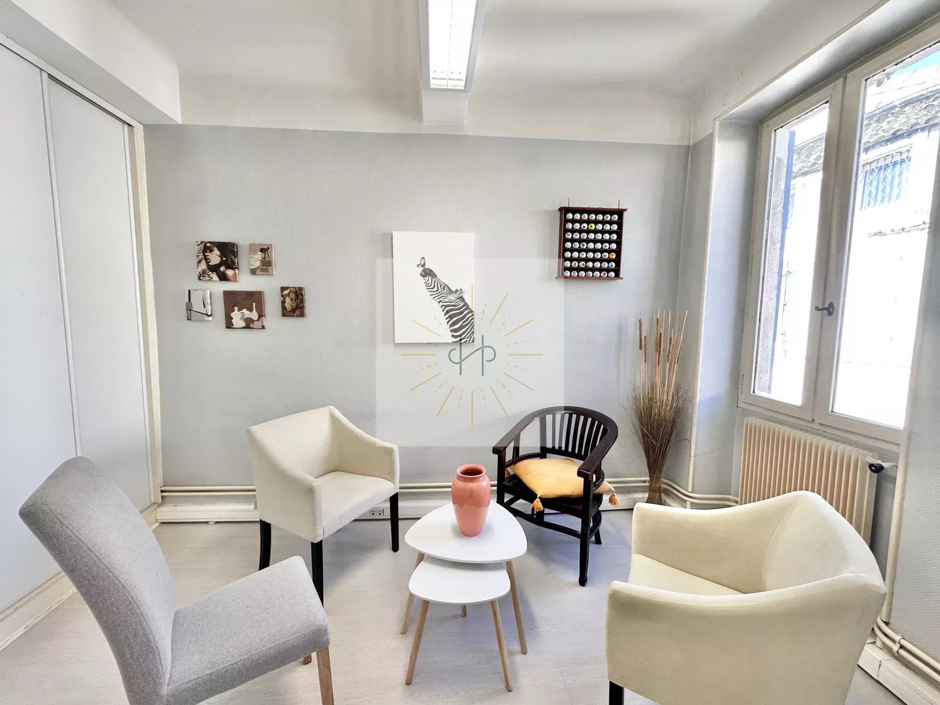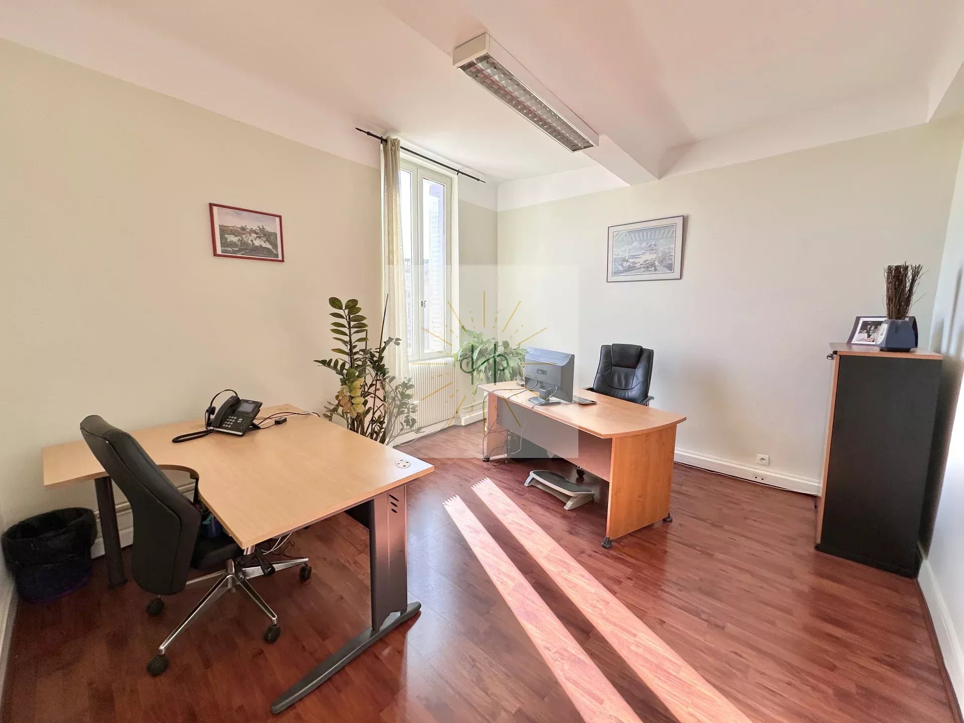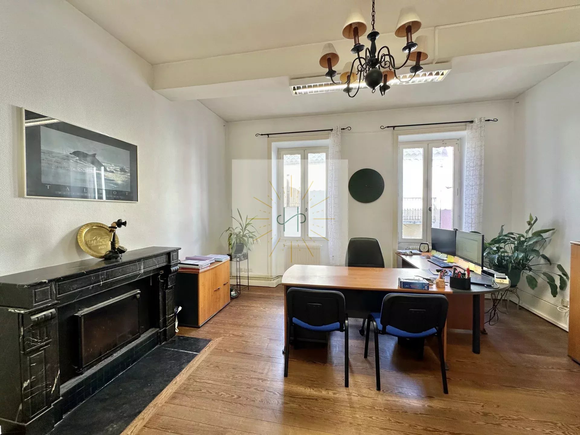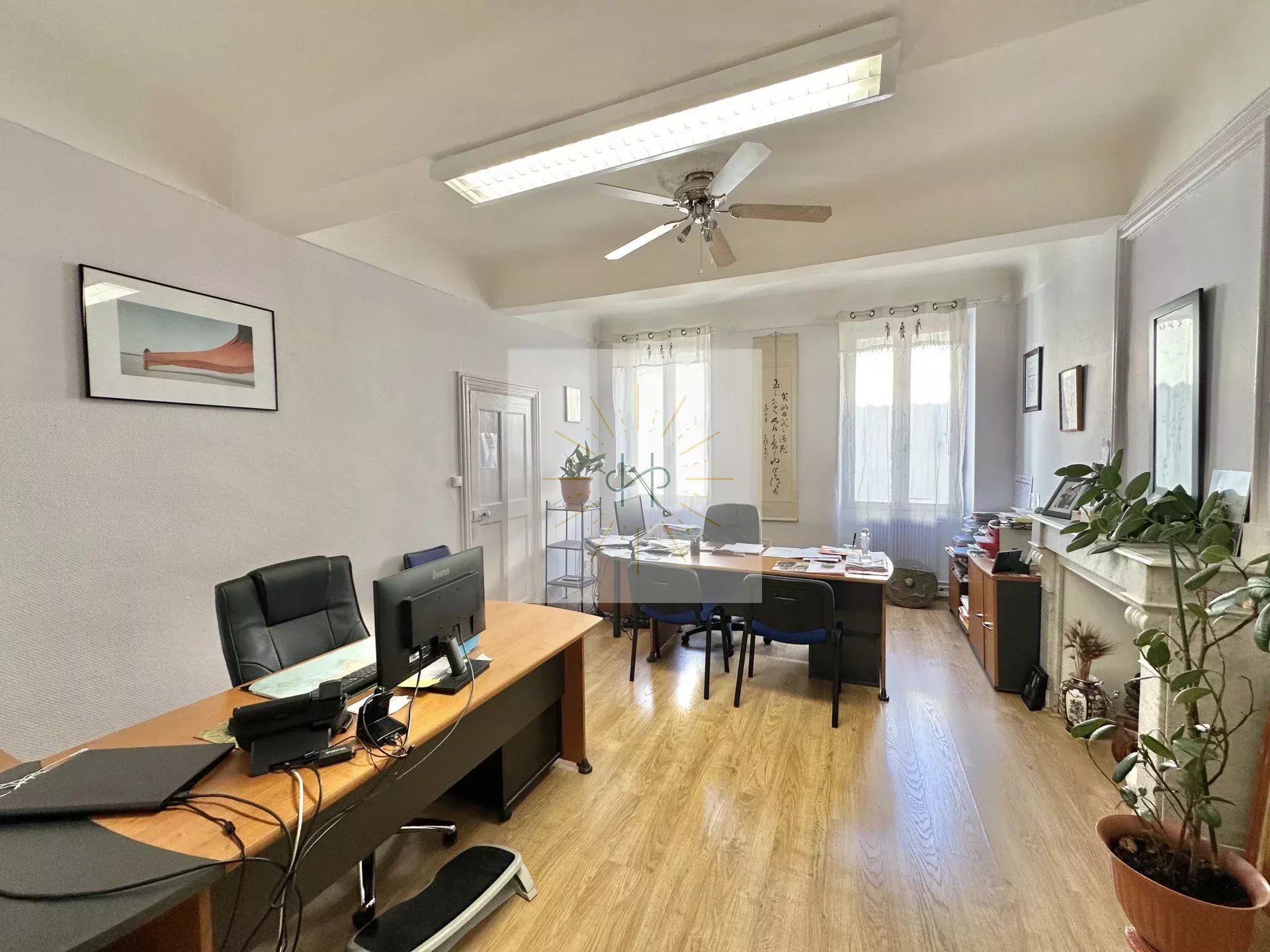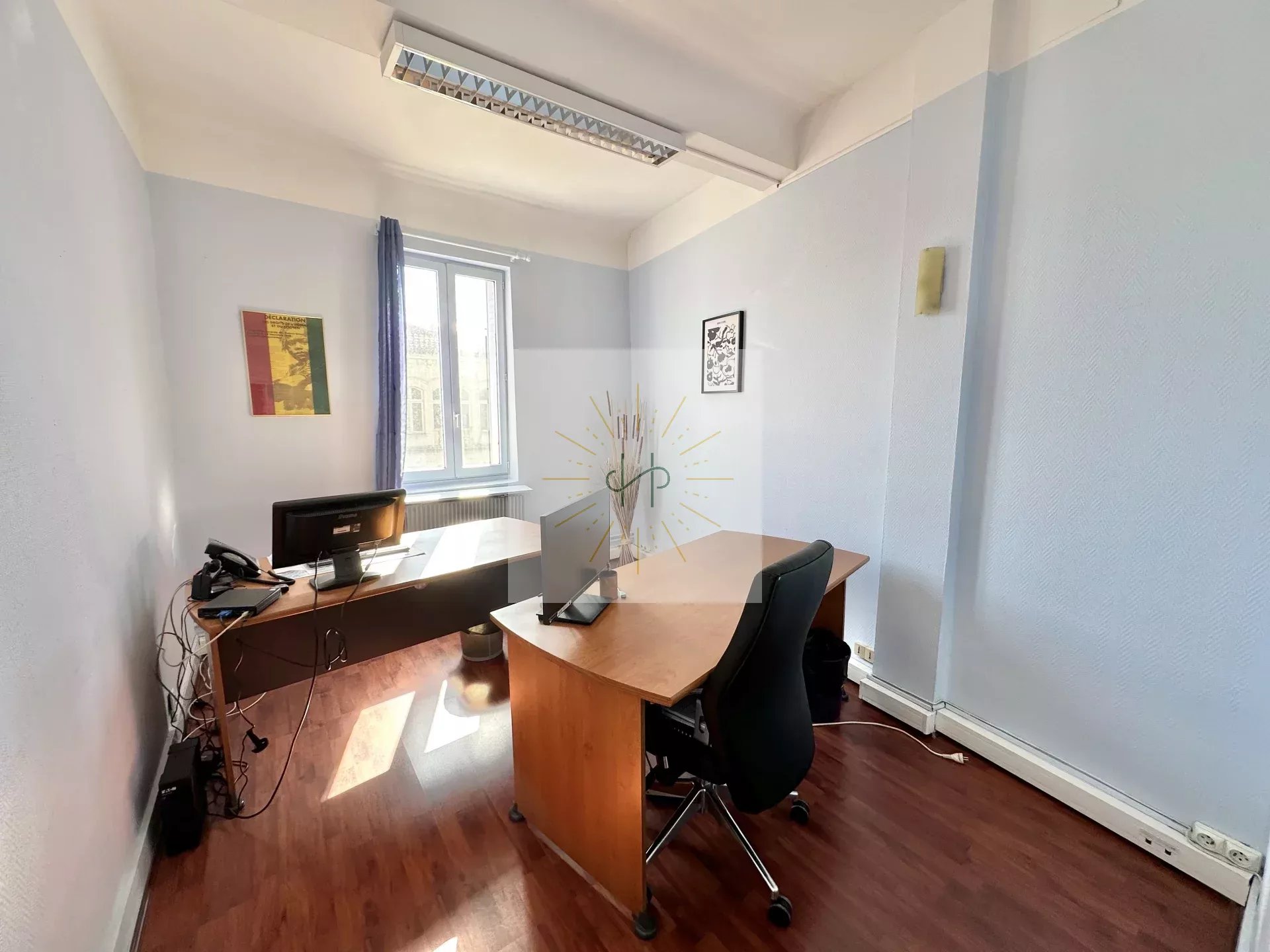 Le bien se compose d’une cuisine équipée, d’un grand salon lumineux, d’une salle de bain, de trois chambres et d’un bureau. Aujourd’hui la pièce de vie et les chambres sont emménagés en quatre bureaux.