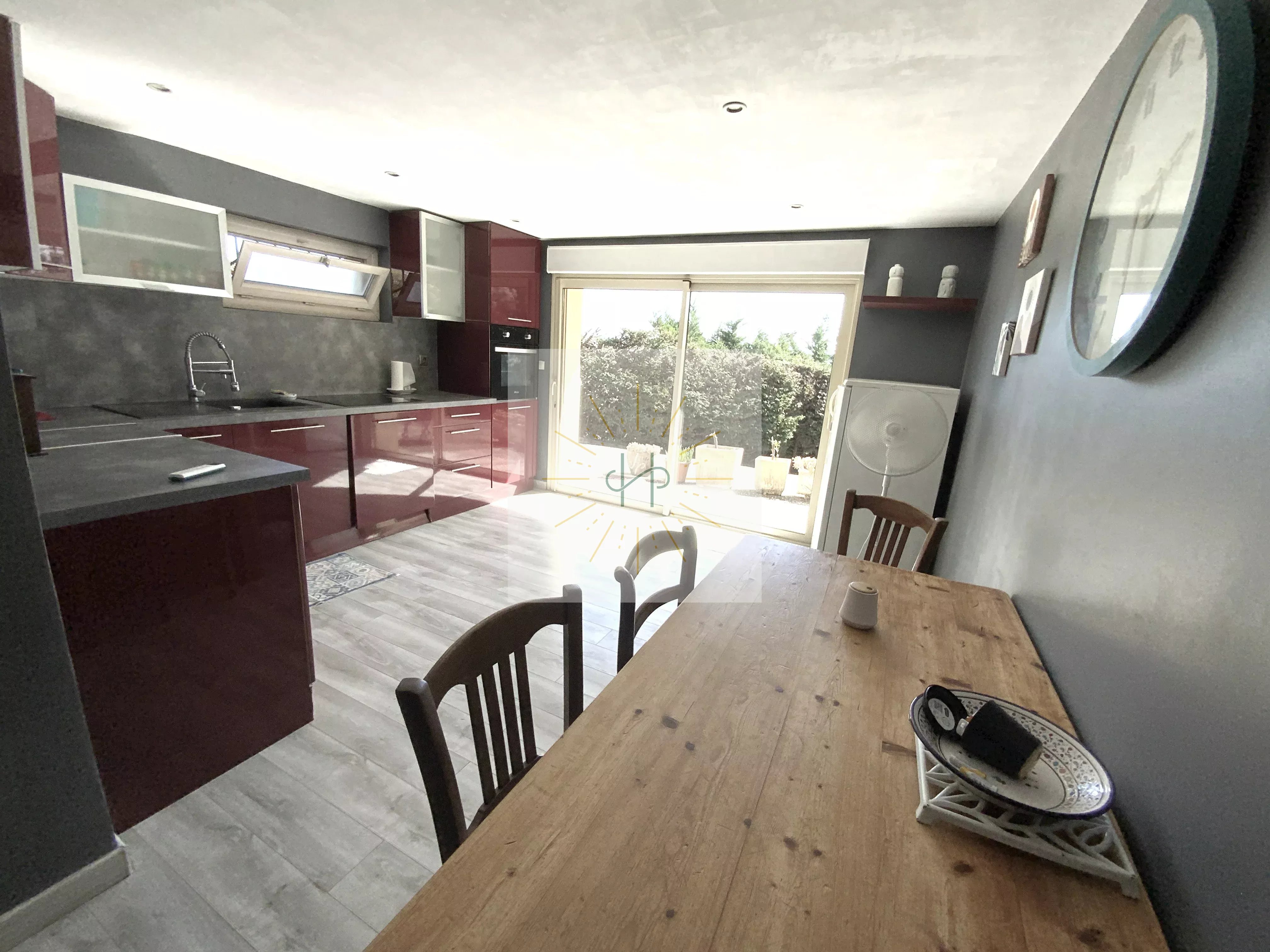 La cuisine donne sur une véranda, offrant une agréable vue quelle que soit la saison.