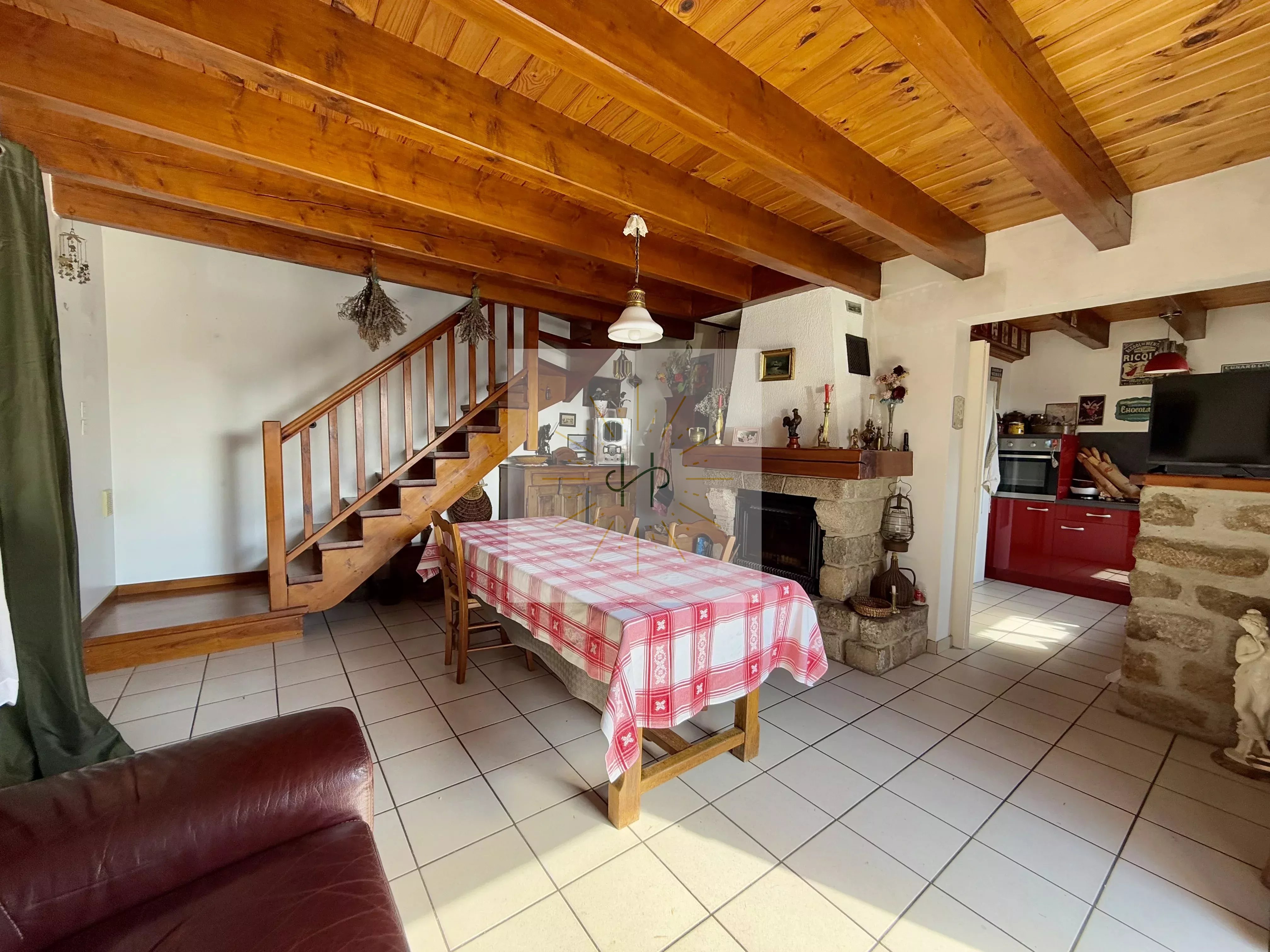 Elle se compose d'une pièce de vie chaleureuse avec sa cheminée, d'une cuisine équipée ainsi que de deux chambres et d'un dégagement pouvant faire office de bureau ou de couchage d'appoint.