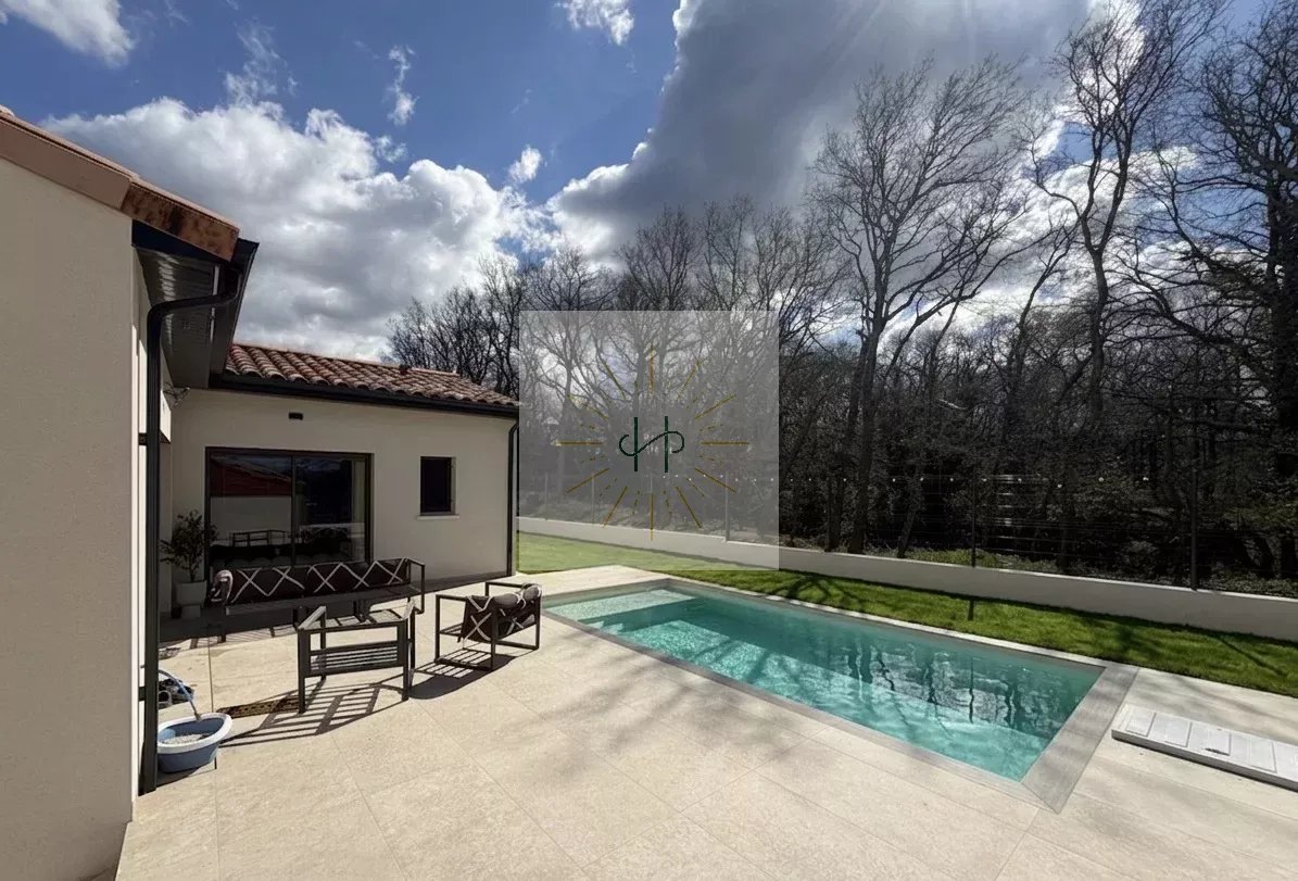 Sur l’extérieur, une parcelle de 440m2, avec une belle terrasse, une piscine, le tout donnant sur un bois, donc sans vis à vis.